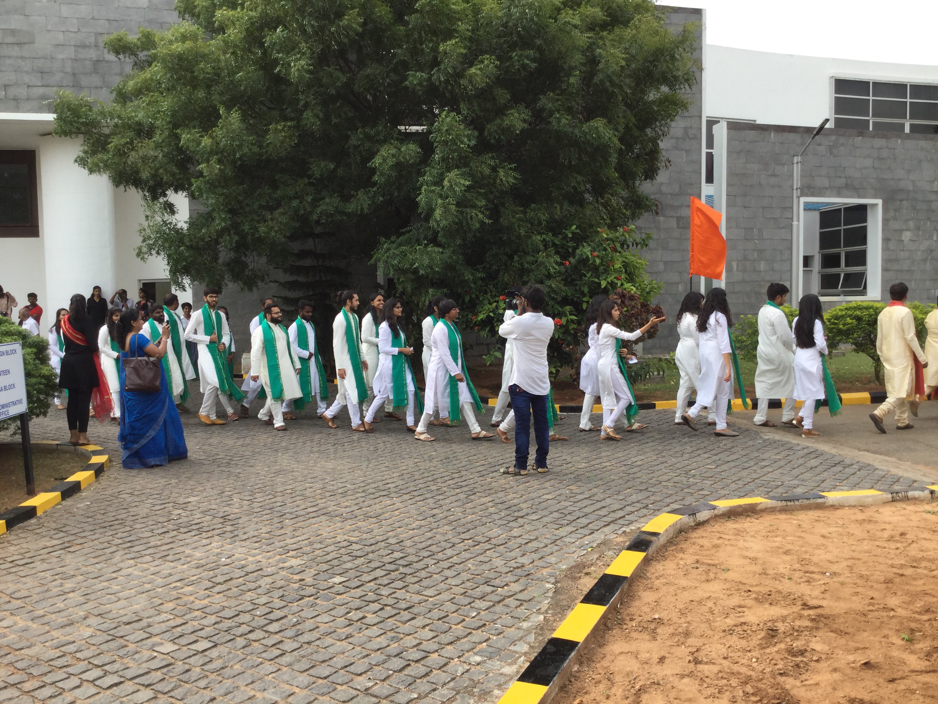The graduates then paraded from the main college building to the auditorium lead by the Dean Prof S Balaram , the Chairman Mr Sanjay Jayavarthanavelu and the Chief Guest Mr Neil Schoenfelder and the faculty, who followed the same dress code, except that the Churidhar kurta was cream and the dupatta was saffron in color.